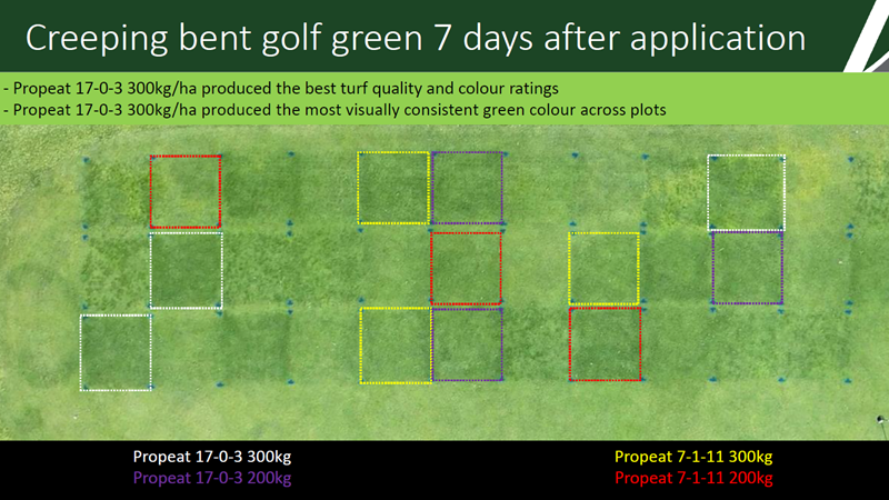 ProPeat was tested in Australia revealing its green response at three different sites. Sydney Bent Golf Green, Sydney Fairway, and Brisbane Hybrid Couch Golf Green saw results within 4-7 days of application and ProPeat far out performed other fertilizers.